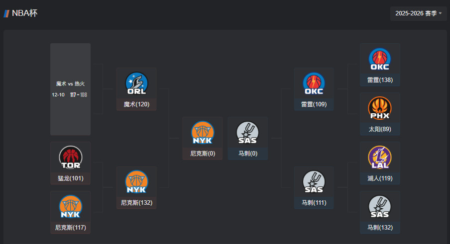 2025NBA杯决赛对阵表已经出炉,马刺将与尼克斯争夺冠军。比赛时间定在北京时间12月17日早上9点半。马刺终结雷霆16连胜挺进决赛;布伦森40分孤胆表演,尼克斯击落魔术。这是两支球队历史上第一次闯入这项赛事的决赛,无论谁夺冠都将创造新的历史。你们看好哪支球队能最终捧起奖杯呢?