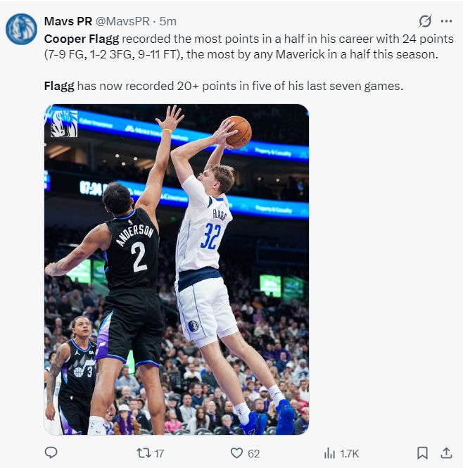 第二节弗拉格延续自己不错的手感,他还命中了一个外线三分球,单节10分2篮板2助攻,上半场18分钟,9中7,三分2中1,罚球11中9,拿到24分4篮板4助攻1抢断,命中率77.8%。他拿到生涯上半场新高得分,也是本赛季独行侠首位半场20+。