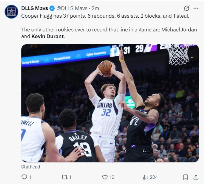 北京时间12月16日,NBA常规赛,达拉斯独行侠以133-140被犹他爵士逆转。这场比赛状元弗拉格迎来了生涯之夜,他拿到生涯新高的42分还有7篮板6助攻,他此役连续创造了太多纪录,首位不足19岁的40+先生,19岁前得分榜超越麦迪历史第三等等,只可惜在加时赛被逆转了。