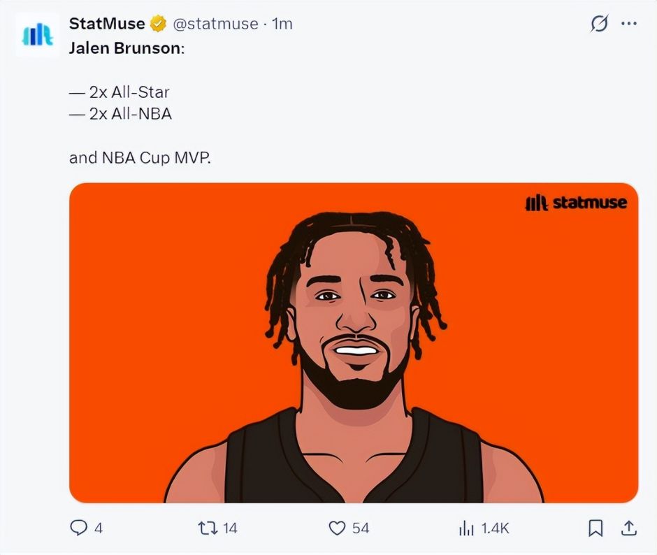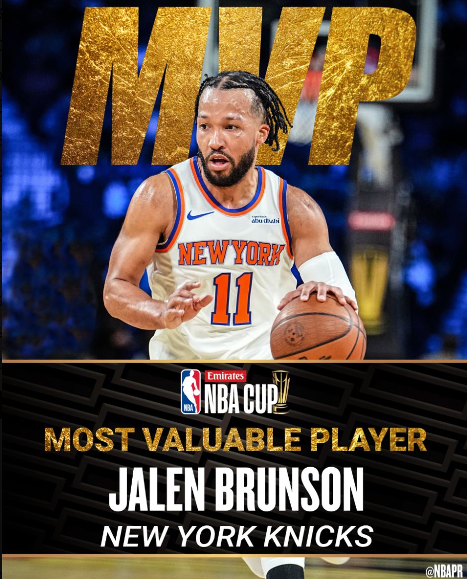 布伦森来到尼克斯已经连续入选全明星、最佳阵容、杯赛冠军、杯赛MVP。他在杯赛淘汰赛阶段场均33.3分6.7助攻,投篮命中率55%,他这个MVP还是实至名归的。