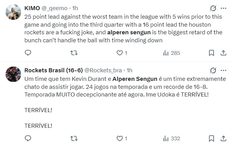 美球迷:输给联盟最差的球队,我们一度领先25分,进入第三节还领先16分,火箭输掉这场比赛就是一个笑话。申京就是这群人里最愚蠢的那个,比赛结束前甚至拿不住球。
