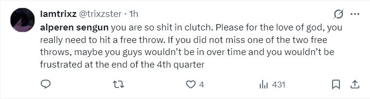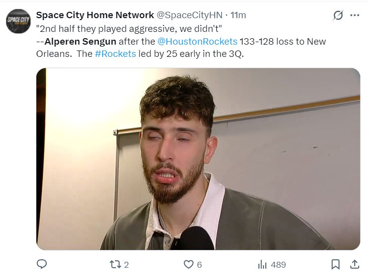 休媒赛后很不满申京关键时刻的表现,终场前44秒申京两罚不中,随后被萨迪克-贝完全绝平,阿门命中后,奎因两罚全中,终场前9秒又是申京获得绝杀机会抛投不中,前场篮板继续不中。