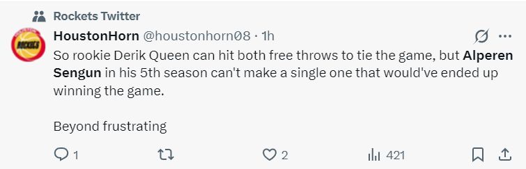 火箭在一度领先西部倒数第一鹈鹕25分的情况下被逆转了,这场比赛堪称联盟截至目前最大的冷门,因为两队的硬实力差距非常明显,上半场火箭专注度在时鹈鹕得分都困难,可下半场火箭过于放松就被鹈鹕各种追分,进入加时赛更是被鹈鹕轻松反超,阿门、小贾、申京各种打铁只有KD一人能得分,可绝平的三分却到不了KD手上。