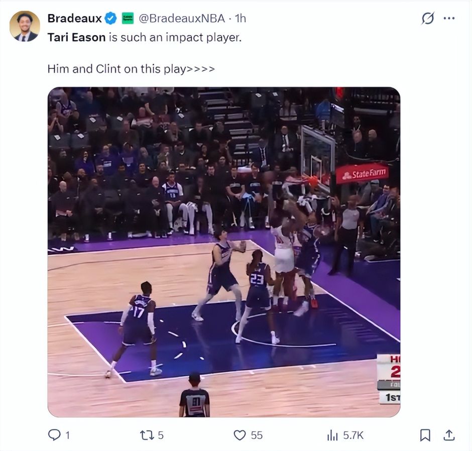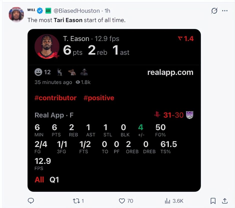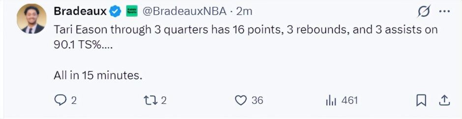 火箭记者Bradeaux写道:伊森三节比赛拿到16分3篮板3助攻,真实命中率高达90.1%,他只打了15分钟而已。