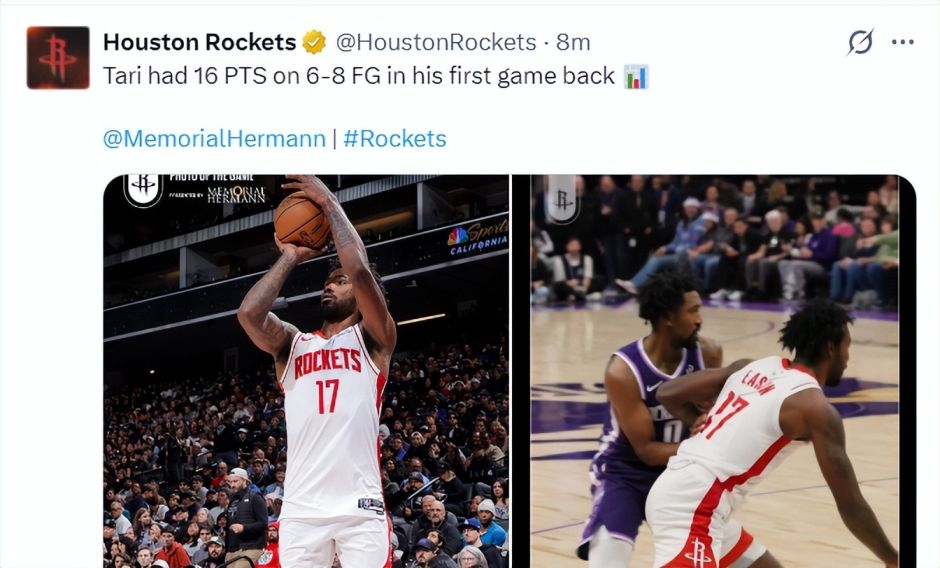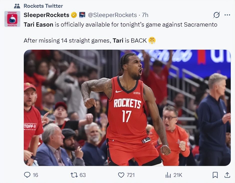 火箭赛后也只晒出了伊森一人的数据欢迎他回归,如果伊森此役没有登场时间限制,火箭大概率就赢了,很明显火箭官方也对被西部倒数第一逆转感到非常不满。