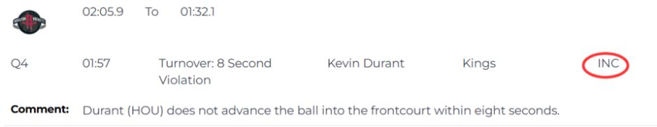 第一次是漏判,发生在距离第四节结束还有1分57秒,裁判报告指出,火箭的杜兰特未在8秒内将球推进前场。这是一次漏吹的8秒违例,火箭获利,国王吃亏。