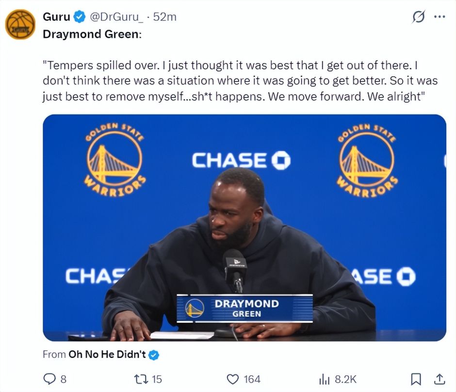 我们喜欢看到德雷蒙德与库里一同打球,他们二人的配合感觉很好,我希望格林能打得自信,不要担心失误就畏首畏尾,我们都需要找到平衡点,每个人都需要做出一些牺牲,一些取舍。