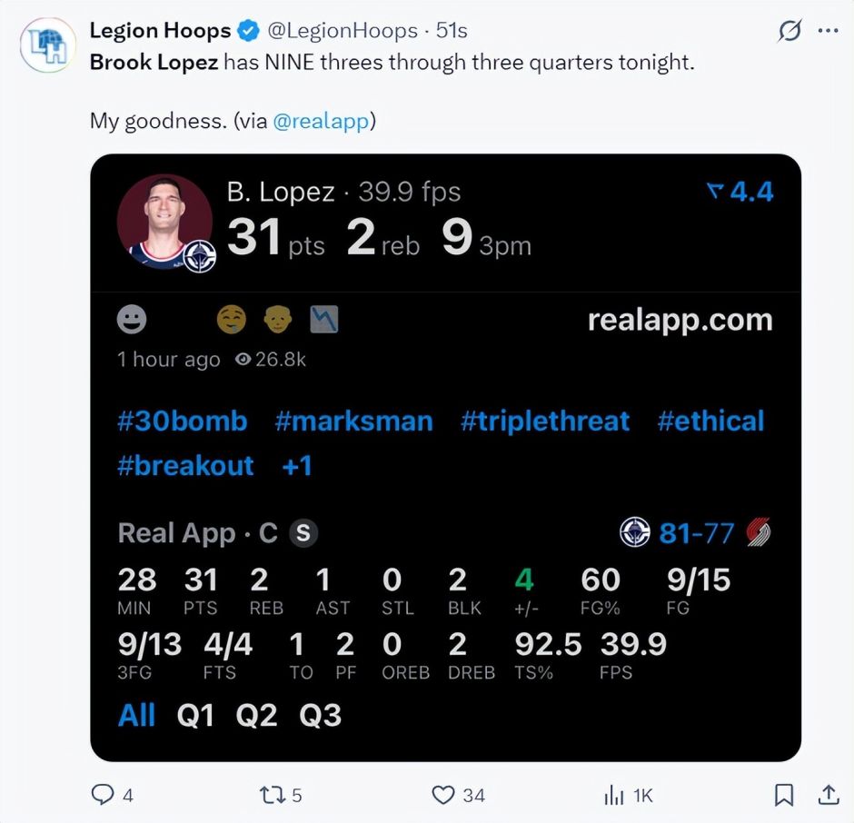 全场比赛大洛33分钟,三分14中9,拿到31分5篮板1助攻2盖帽,三分命中率64.2%,就连快船官方都写道这个夜晚的大洛直接登上了全美第一热搜,37岁单场命中9个三分球以上的球员只有詹姆斯、库里、大洛三人。