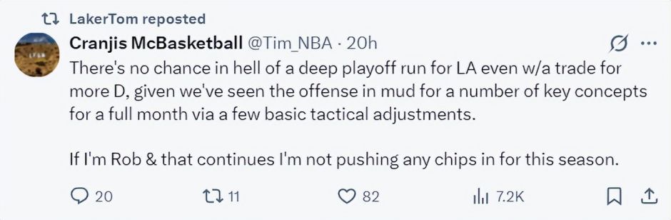 美媒CMB写道:就算LAL交易得到更多防守球员我也不觉得他们能在季后赛中取得成果。因为过去一个月我发现这支湖人不仅是防守差,他们的进攻体系在多个关键方面都出现了严重的问题,而这些问题不是一些基础的战术调整就能改变的,如果我不是佩林卡,这些问题在交易截止日前解决不了,我是不会进行任何交易投入的。