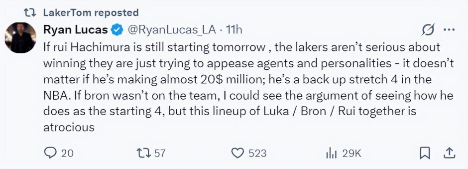北京时间12月28日,湖人记者瑞安-卢卡斯明确表示,如果湖人还是用八村垒打先发那么他们就不是真的想赢下比赛,他们只是在试图安抚经纪人与一些球员,八村垒虽然接近2000万的年薪但他的实力只能是NBA替补,如果詹姆斯不在队内湖人不可能给他先发,他搭档詹姆斯、东契奇的先发太糟糕了。