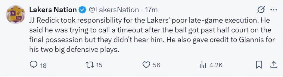 湖人101-105逆转雄鹿失败,这场比赛湖人一度落后雄鹿12分,末节在詹姆斯的爆发下完成反超,可进入决胜时刻湖人攻防两端都断电了,尤其是16.2秒东契奇送三分犯规后,雷迪克手握2个暂停都不叫暂停,结果导致詹姆斯被扬尼斯抢断葬送比赛,詹姆斯被推上风口浪尖。