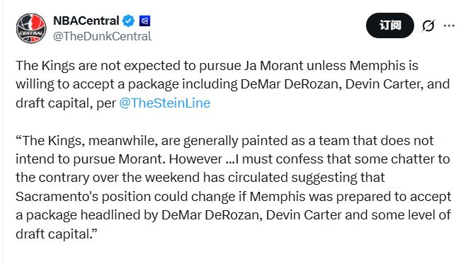 Stein写道:“国王队一直被普遍认为无意追求莫兰特。不过…… 我必须坦言,周末出现了一些相反的传言,称如果灰熊愿意接受以德罗赞、德文-卡特为核心,外加一定选秀资产的报价,萨克拉门托的立场可能会发生转变。”
