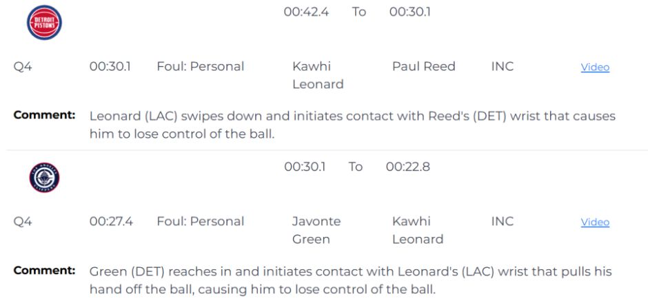 第二次漏判,出现在距离比赛结束还有27.4秒,也就是莱昂纳德抢断完成后不久,活塞队的格林伸手切球,也碰到莱昂纳德的手腕,将他的手从球上拨开,致使莱昂纳德丢球。这同样是一次漏吹的防守犯规,不过,这一球最终出界,球权还在快船手中。