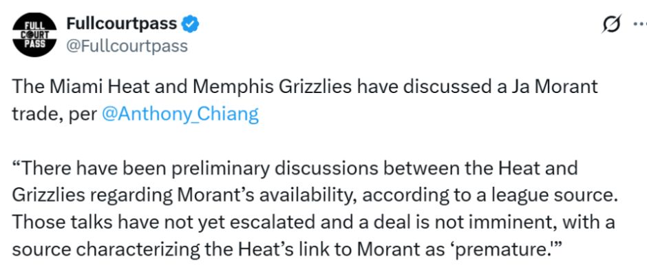 名记Kelly Iko报道,在ESPN近期曝出灰熊队在莫兰特的职业生涯中首次考虑听取针对他的报价后,“近几日,迈阿密已迅速成为莫兰特及其团队眼中颇具吸引力的选择”。
