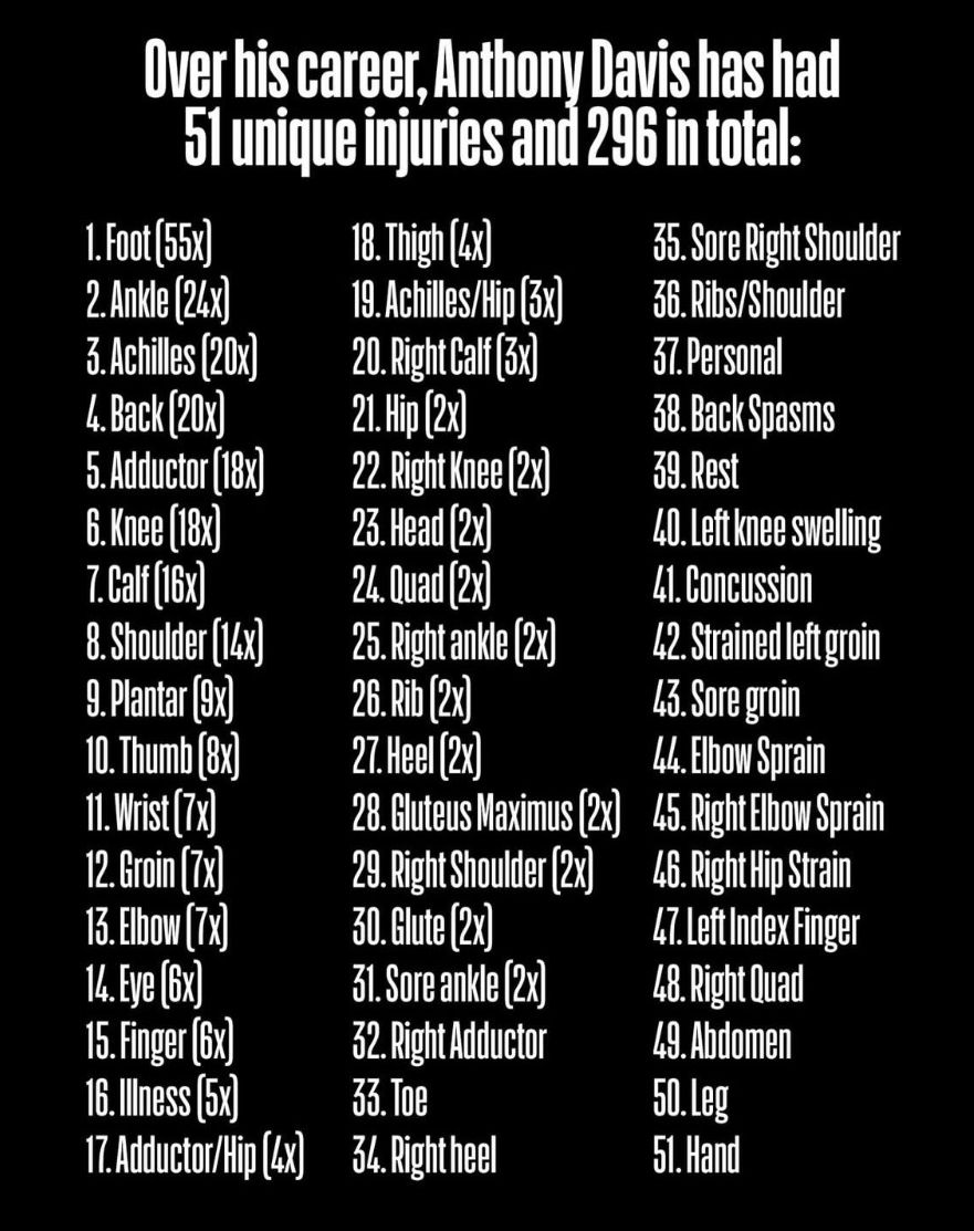 根据美媒的统计,安东尼-戴维斯自进入联盟起他就是一个玻璃人,生涯14个赛季已经遭遇了296次伤病其中还有51次非常特殊的伤病。