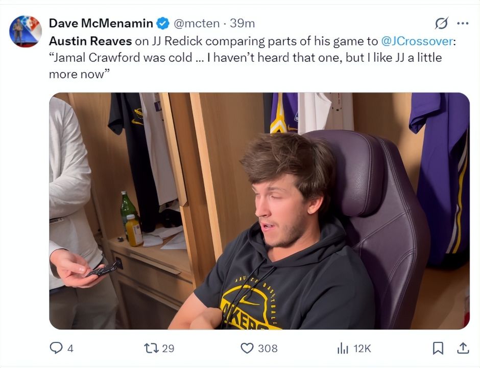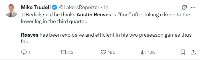 里夫斯轰21+3小腿被撞:雷迪克称情况还行 湖媒晒两战41分状态神勇