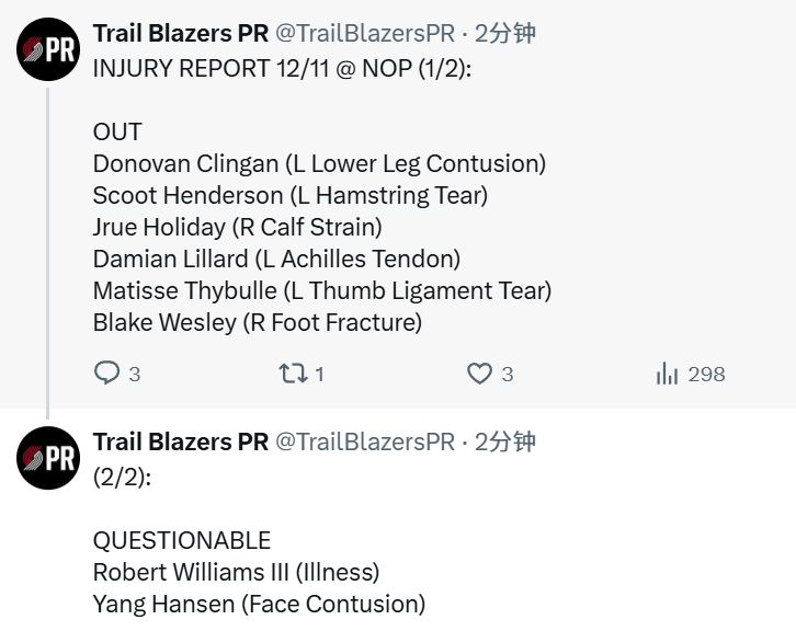 北京时间12月11日,开拓者官方更新了明日对阵鹈鹕的伤病报告,杨瀚森因面部挫伤被列为出战成疑。