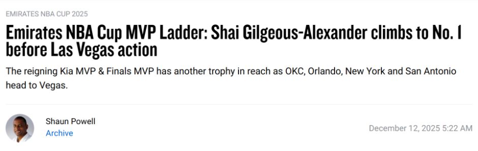 北京时间12月13日,随着NBA杯四强的产生,NBA官网也更新了杯赛MVP的排行榜。雷霆球星亚历山大升至第一,尼克斯球星布伦森排名第二。上期排名第一的东契奇,由于湖人已经被淘汰,他的排名也跌至第七。以下是具体排名——