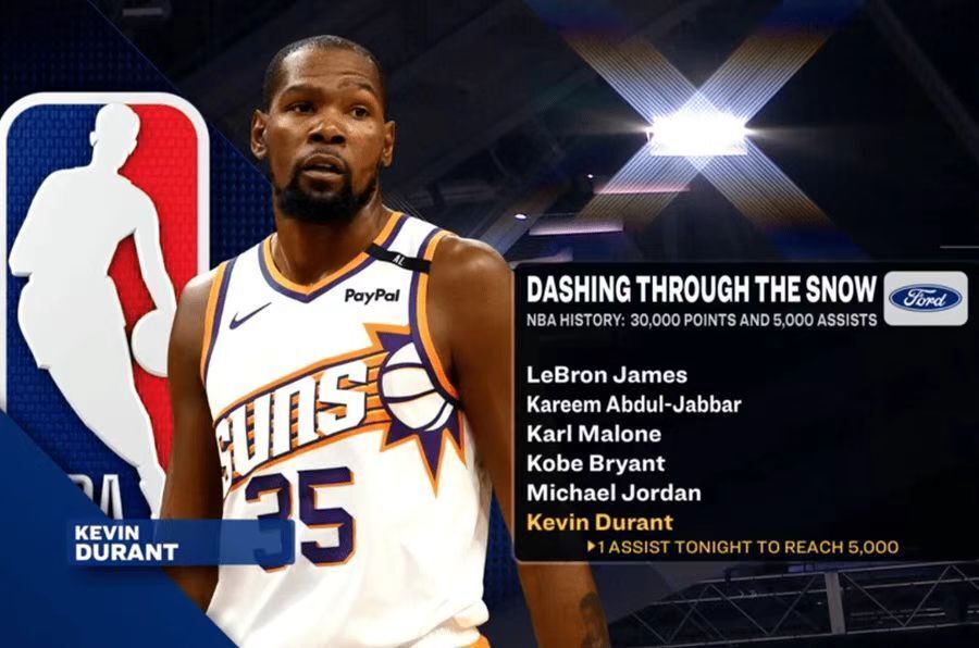 杜兰特达成生涯常规赛5000次助攻里程碑。