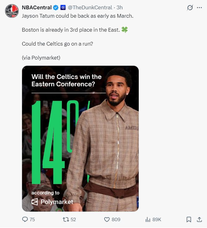 根据数据媒体PM的预测,杰森-塔图姆最快在三月份就要复出,届时这支绿凯将成为完全体,獭兔复出后这支绿凯又可以去冲击总冠军?布朗坐等獭兔复出吧。