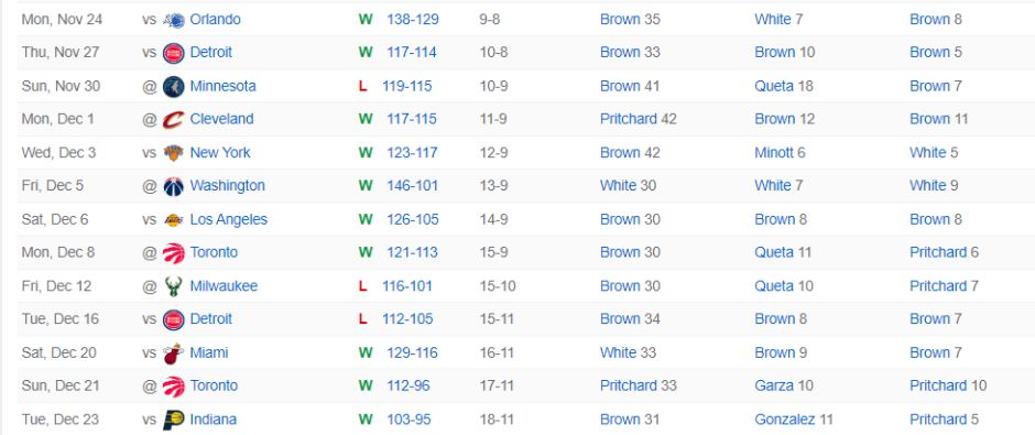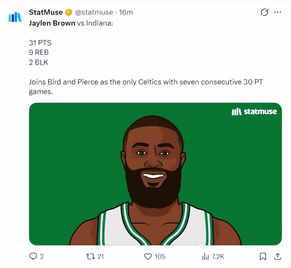 全场比赛布朗33分钟,25中11,三分6中2,罚球8中7,拿到31分9篮板2助攻1抢断2盖帽,命中率44%,三分命中率33.3%,真实命中率54.3%,他已经连续7场比赛拿到30+比肩保罗-皮尔斯,仅次于9场是伯德。