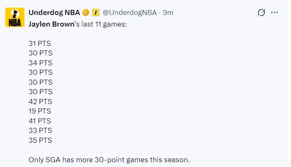 过去的11场比赛布朗有10场拿下30+,本赛季布朗已经拿到17场30+联盟仅次于雷霆核心亚历山大,如果谁还说布朗不值顶薪?