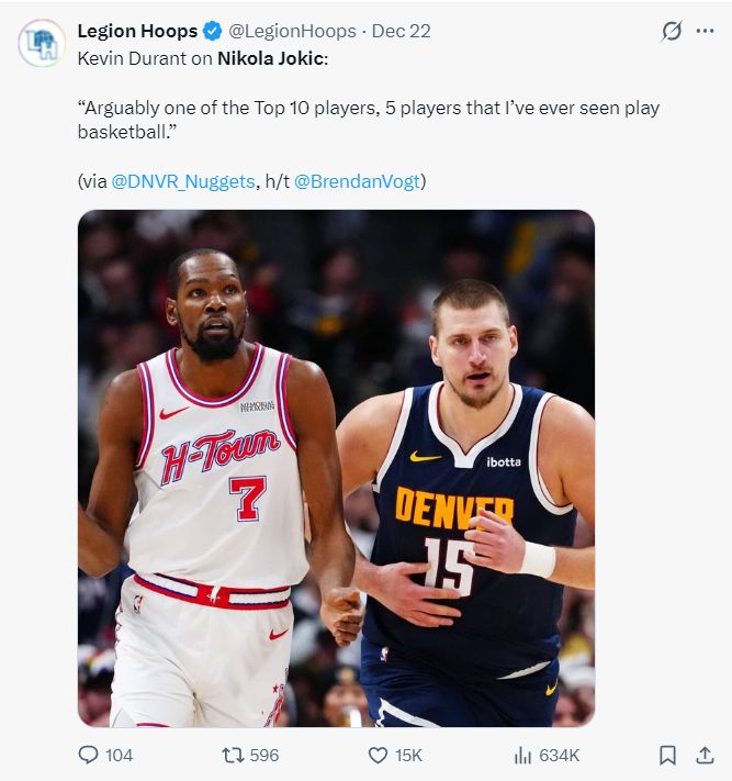 一天之前,凯文-杜兰特在评价约基奇时:我认为他是历史前十的球员,甚至是历史前五。