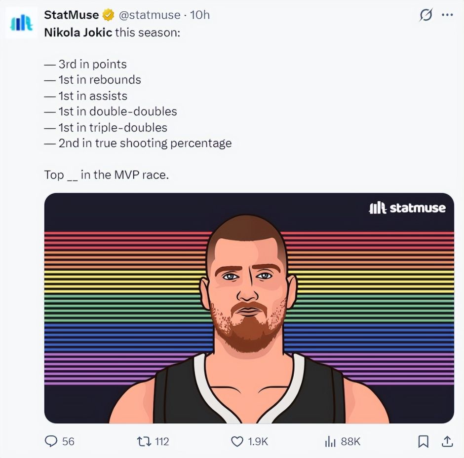 数据媒体StatMuse写道:约基奇本赛季得分联盟第三、篮板联盟第一、助攻联盟第一、两双联盟第一、三双联盟第一、投篮命中率联盟第二,大家觉得他是MVP榜单第几的选手?
