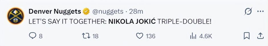 掘金官方发来贺电:让我们一起高呼:尼古拉-约基奇又完成了三双。